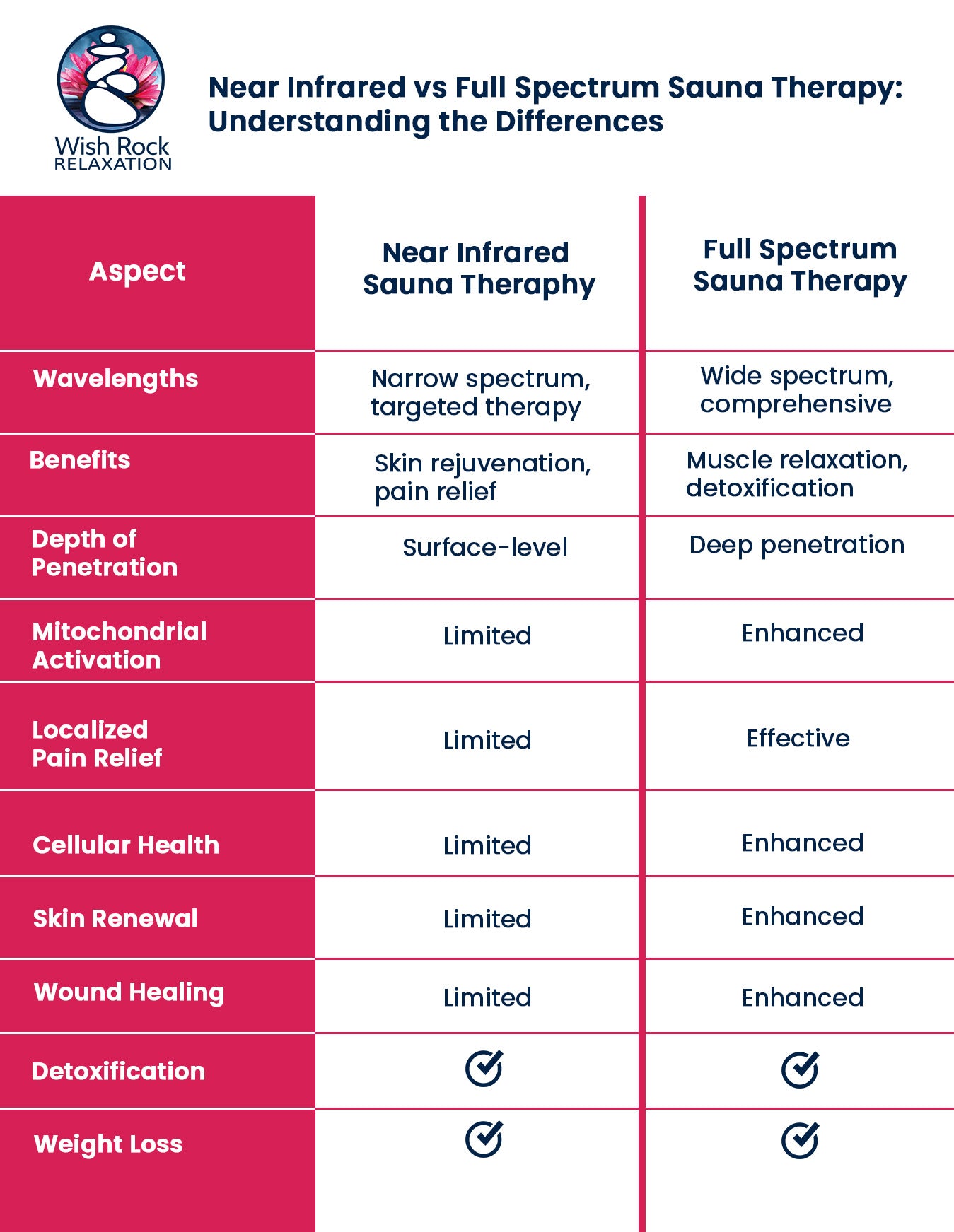 - Near infrared saunas emit a narrow spectrum of wavelengths, targeting specific therapeutic benefits such as skin rejuvenation and localized pain relief.