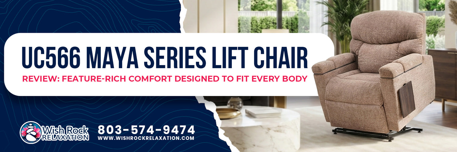 When someone you care about needs a lift chair, it can be overwhelming to know what the best lift chair option is and what to research–especially if you’re new to lift chairs. The UC566 Maya Series is one of the best options available right now and really hits it out of the park, as it’s got something for virtually everyone. The Maya is comfortable without being complicated, supportive without feeling clinical, and thoughtfully designed for real, everyday use. The ability to choose the right size for your exact body type is unmatched in the industry–there are four options to choose from: Small, Medium, Large and Extra Wide. Because the UC566 is Made in the USA, you can fully customize it with Add-Ons such as a footrest extension to accommodate taller users, pick the color of your choice to match your decor or even add additional attachments to the innovative open-arm design. You will enjoy a gentle massage and warmth with the standard Nirvana™ Swedish air massage and Far Infrared Heatwave™ Technology that mimics the advanced technology of our massage chair with heat that penetrates at a cellular level. The 4-Zone Comfort System allows for infinite positioning so that you can independently control the backrest and the legrest to get into the therapeutic Zero Gravity position or raise the legs even higher into Trendelenburg, while Power Pillow and Power Lumbar adjustments allow you to find the perfect comfort fit for your chosen activity. With the innovative and convenient Open Arm Storage, you will be able to enjoy convenient charging (both USB and wireless), cupholders for your beverages, store small items within reach, have use of the standard reading light and tray table or choose optional add-ons to enhance our overall experience. It is easily one of the most trusted models right now, and it’s simply a chair we feel confident recommending to family, friends, and customers alike.