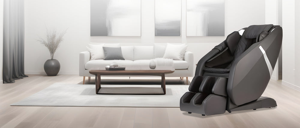 Katana 700 3D Massage Chair in Black color; Lifestyle image in a cozy room from Wish Rock Relaxation