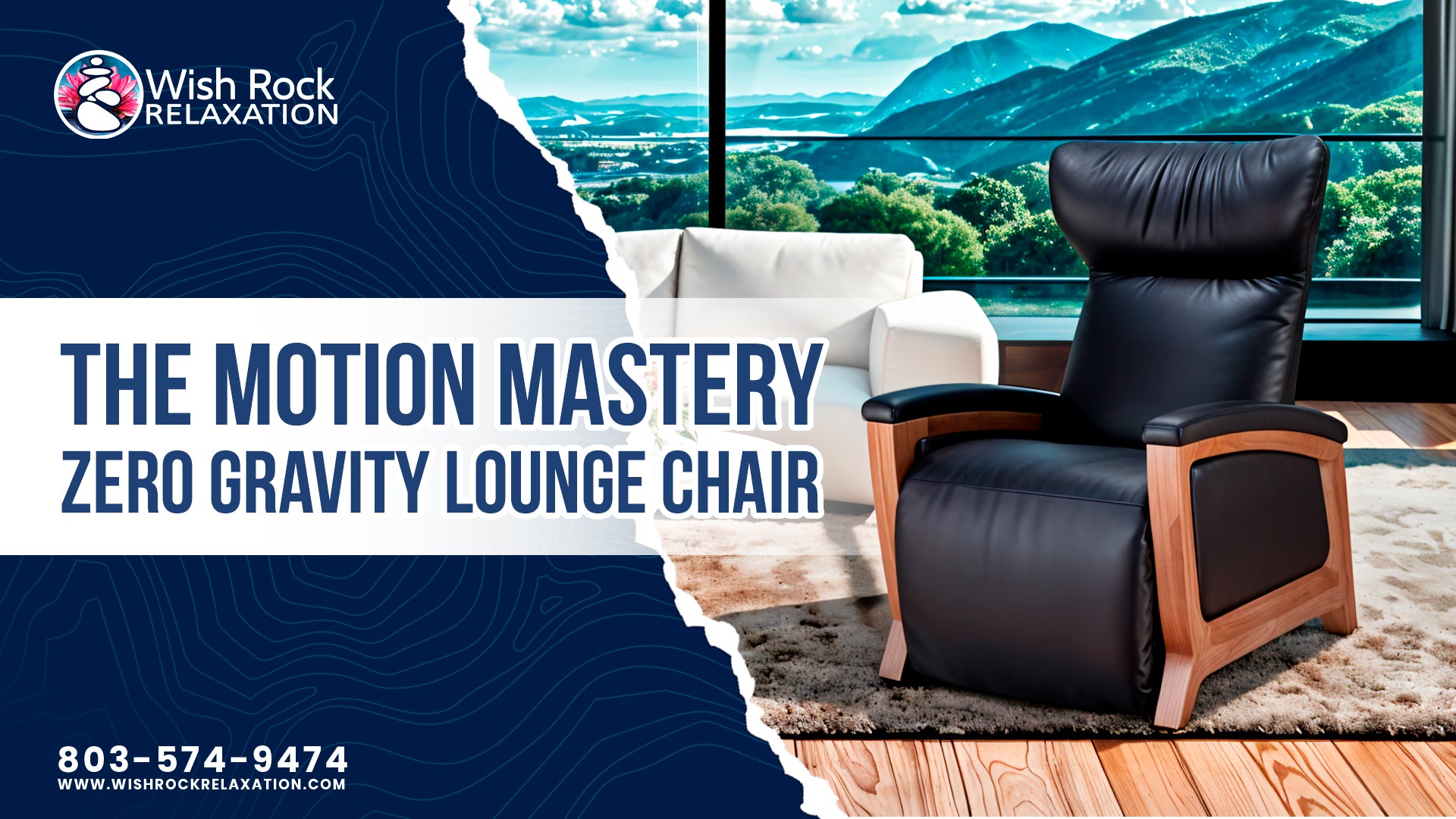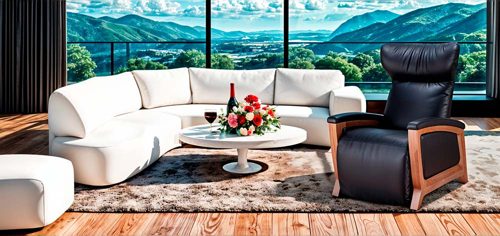 in black leather and wood finish placed in a modern living room with mountain view from Wish Rock Relaxation.